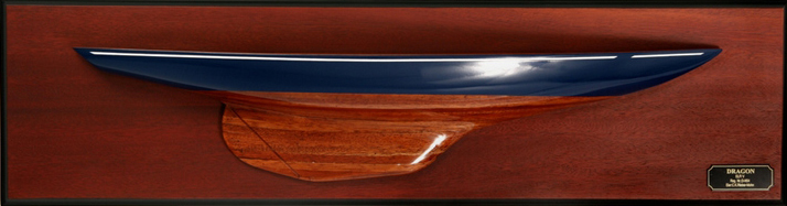 Hand-crafted plank-on-frame wood hull with blue topsides, white cove stripe . Varnished stained wood hull.