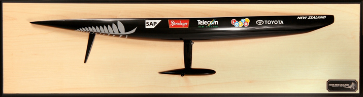 Hand-crafted plank-on-frame wood hull with glossy black hull and sponsors logos . Mounted on a light wood back board.