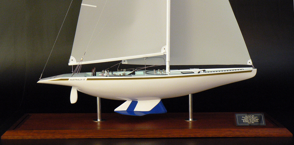 Designed by Ben Lexcen, built by Steve Ward, owned by Alan Bond and helmed by John Bertrand. Lexcen’s Australia II design featured a reduced waterline length and a short chord winged keel which gave the boat a significant advantage in maneuverability and heeling moment (lower ballast C of G) but was a significant disadvantage in choppy seas. The boat was also very quick in stays.The winged keel was a major design advance, and its legality was questioned by the New York Yacht Club.
