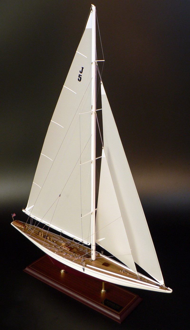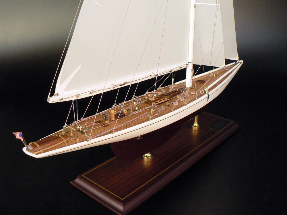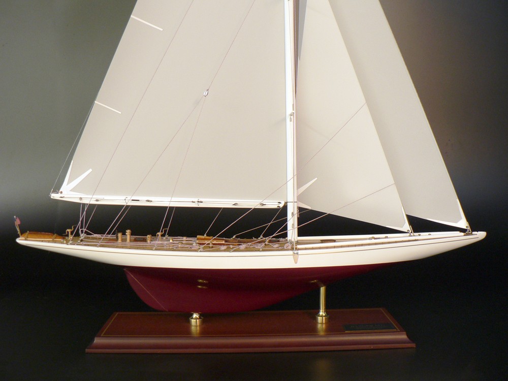 Model comes with or without dacron sails and  is ready to display. It is mounted with brass pedestals on a high quality hardwood display base with a gold trim.