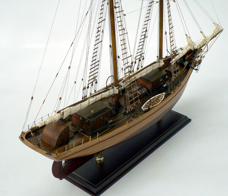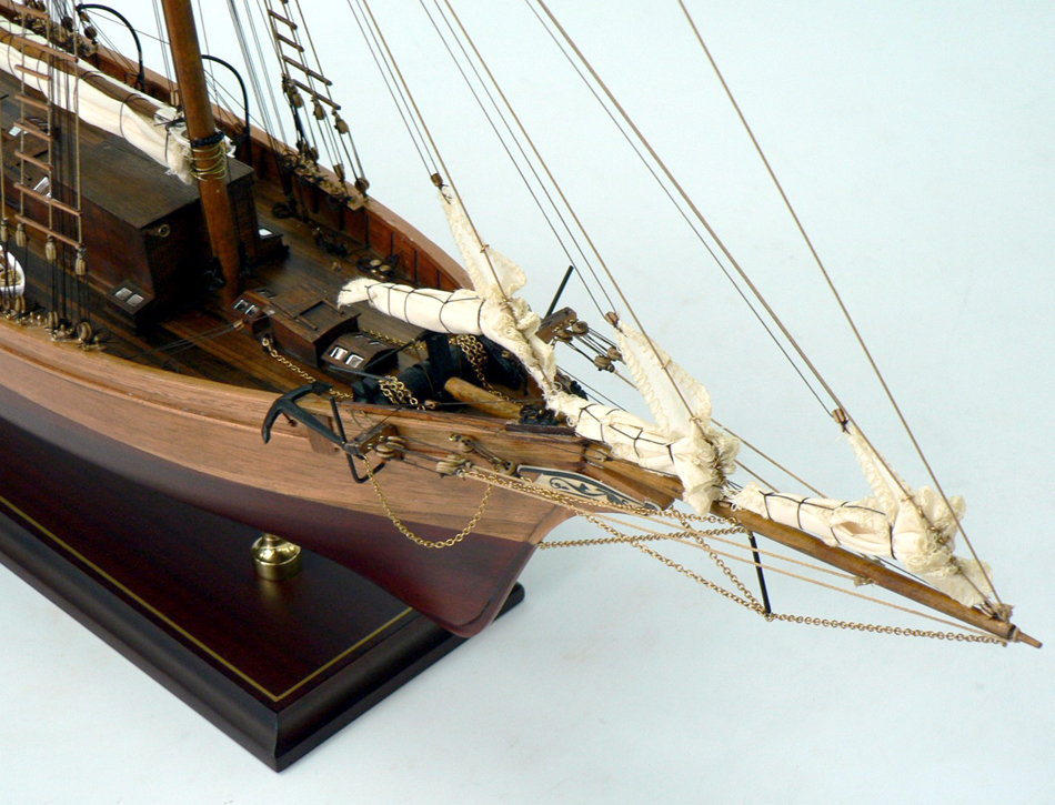 The heading stability of those schooners is perfect as the sailing balance due to the length of the keel and the well balanced shapes of the hull. Averages speeds between 7 and 10 knots may be reached with a well settled wind.