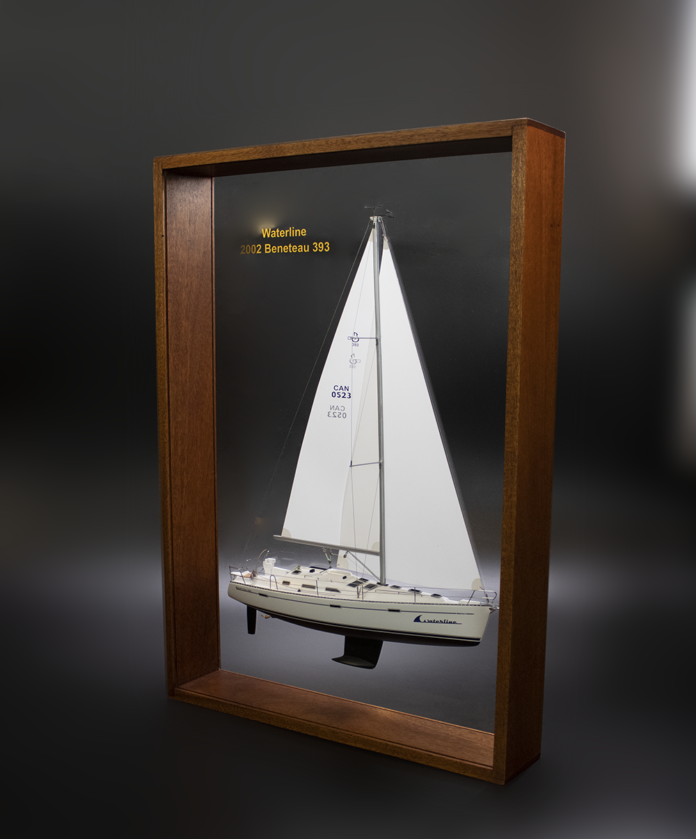 See this tremendous framed half model of the Beneteau 393 built at scale 1/32 or 15″LOA.
