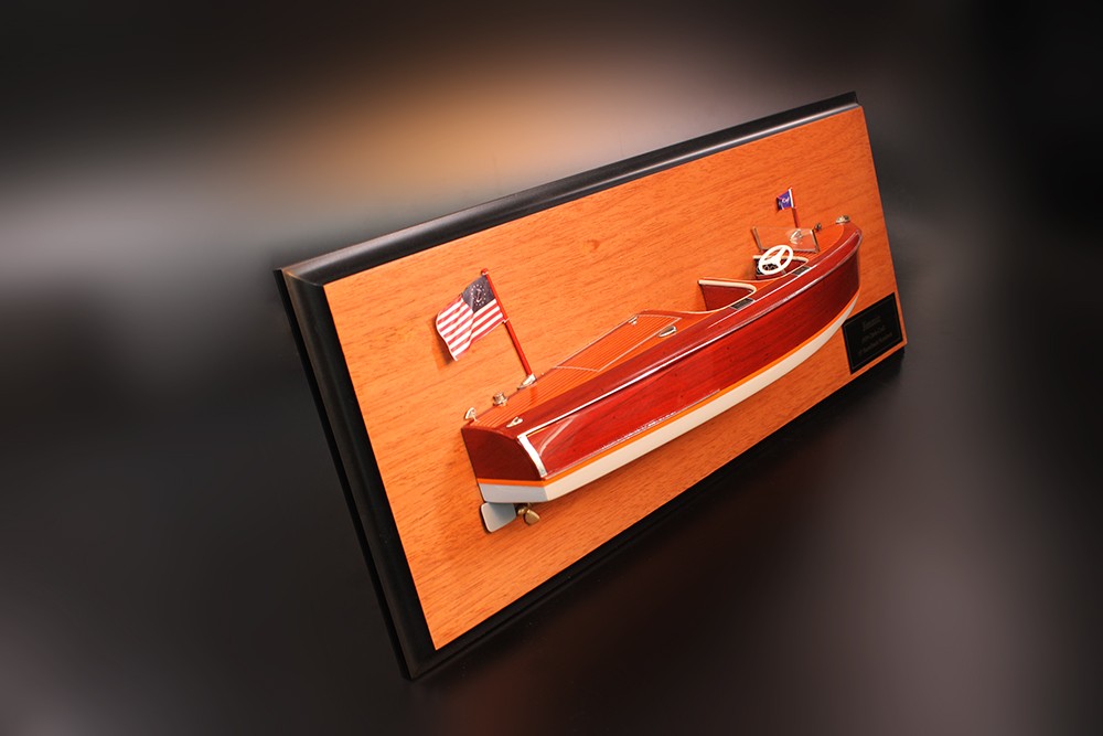 Discover the timeless allure of the Chris Craft 19’ Double Cockpit Barrelback Runabout of 1939 with our exquisite 14.25 inches wooden half-hull replica!