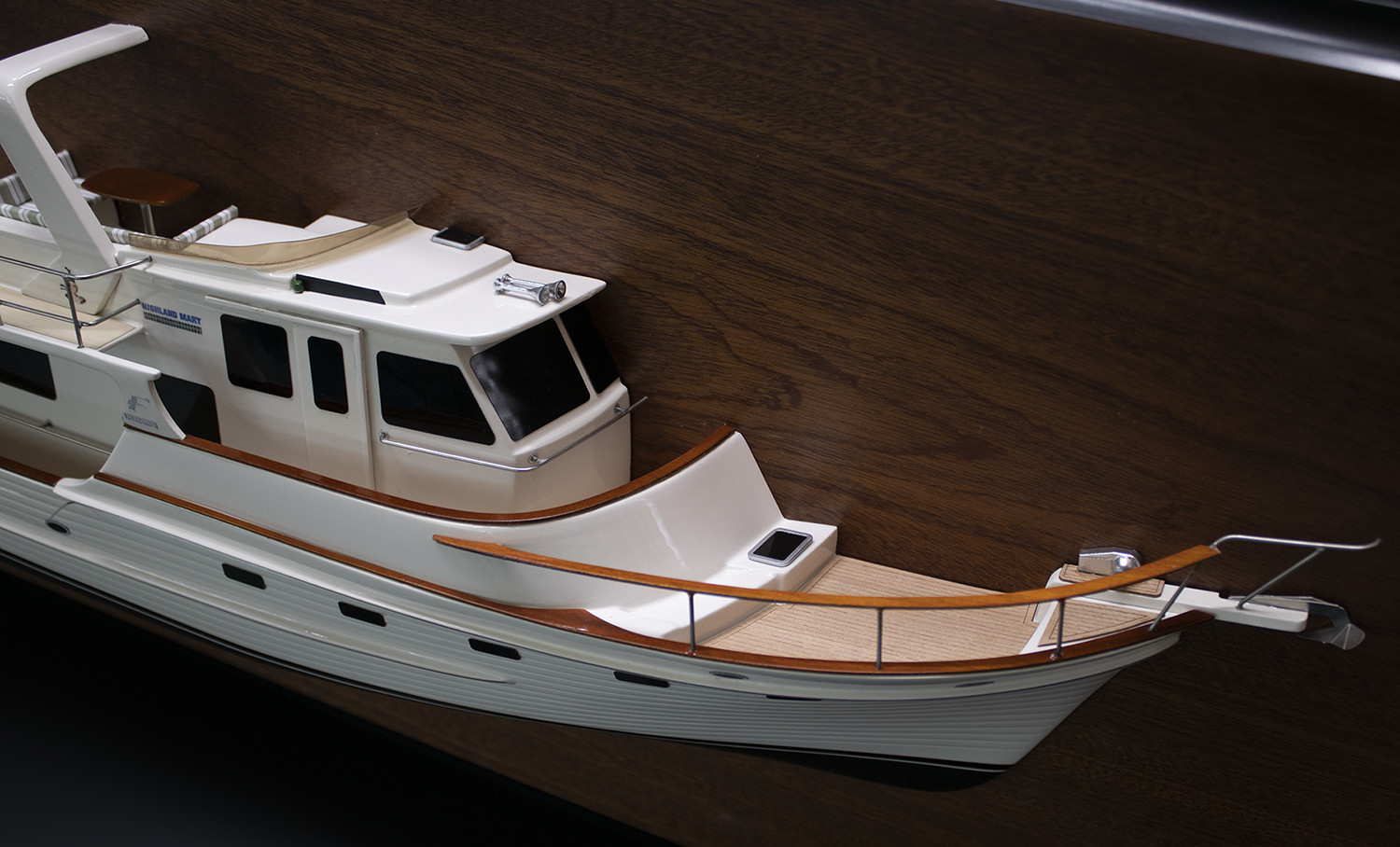 Admire this striking custom half model with deck details of the Fleming 55 with Enclosed Flybridge, built upon request at scale 1/32 or 21 inches LOA.
