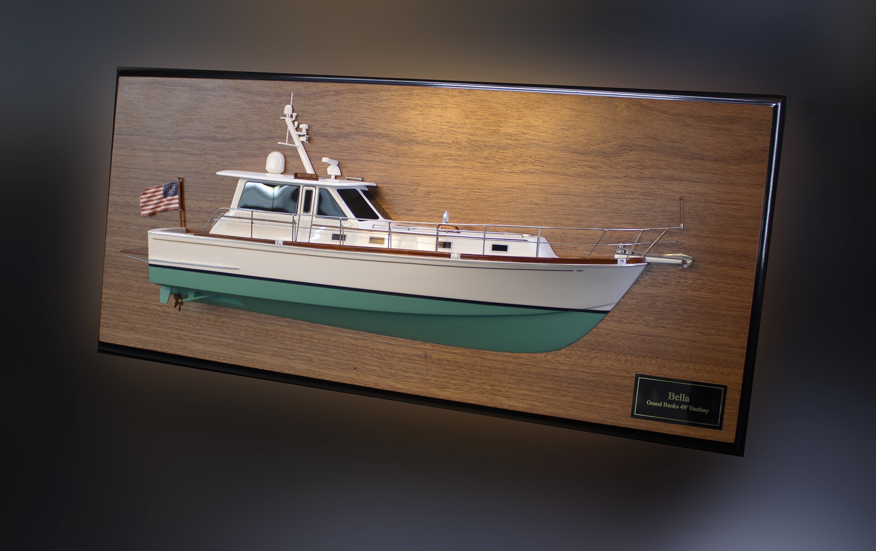 Gaze at this striking custom half model replica of the Grand Banks 49 Eastbay built upon request at scale 1/32 or 18″LOA.