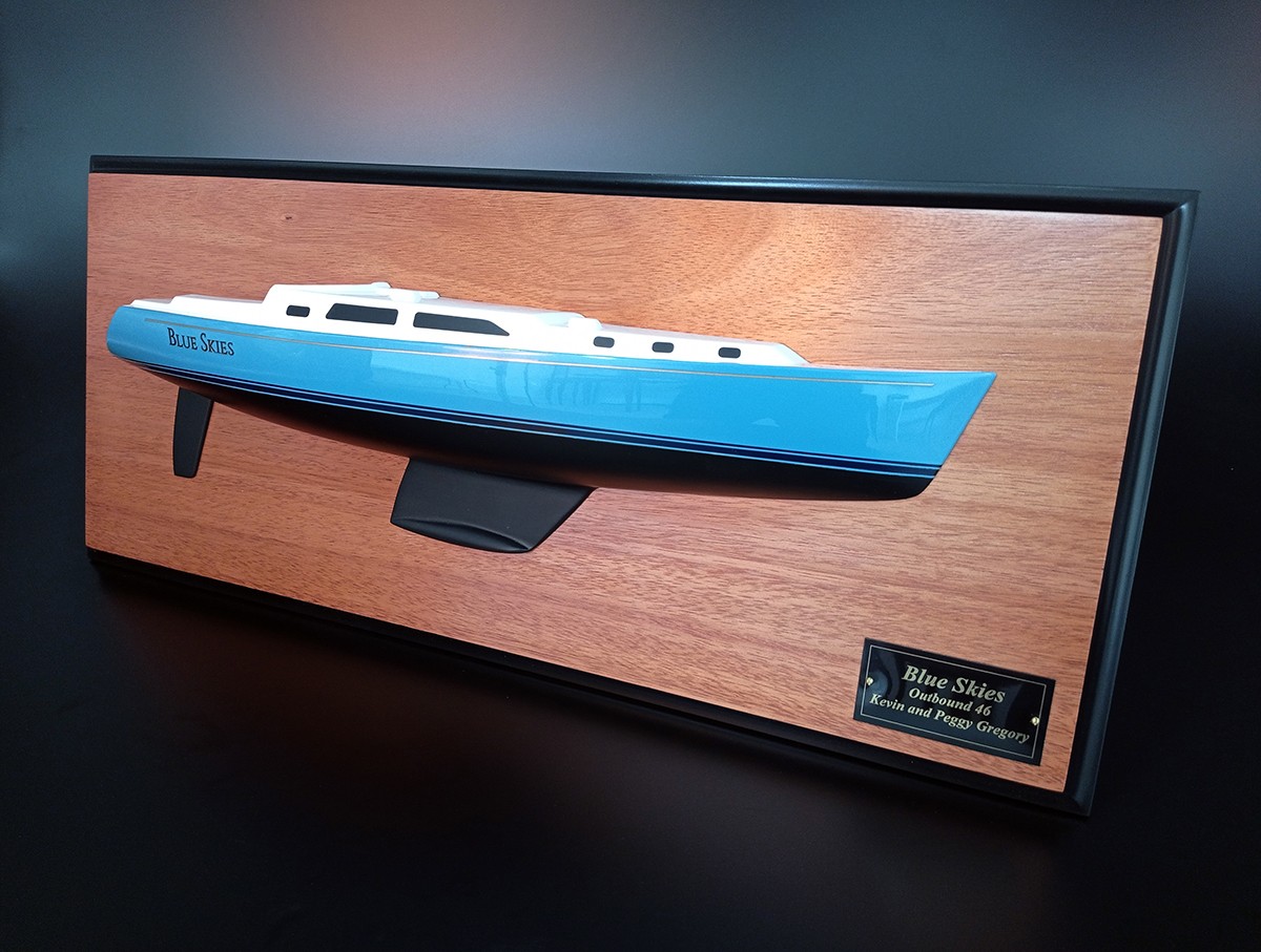 See this impressive custom half model with cabin and cockpit only of the Outbound 46 built at scale 1/30 or 18 inches LOA.